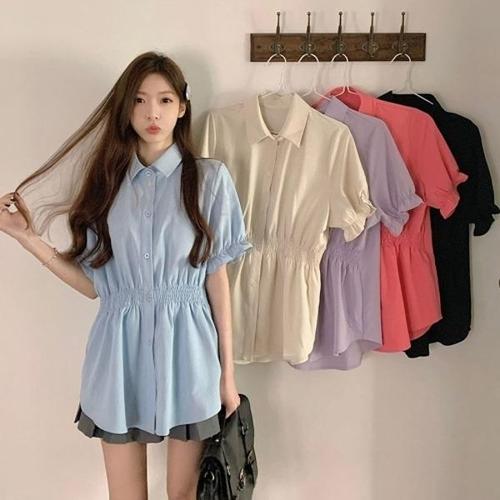 [엄지척]허리 스모크밴딩 카라넥 소매 셔링 롱 셔츠_19660337_667501
