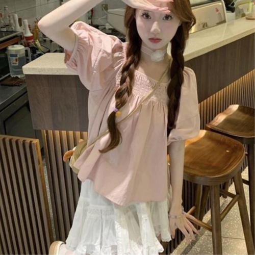 [옷자락]여성 스퀘어넥 스모크 반팔 플레어 블라우스