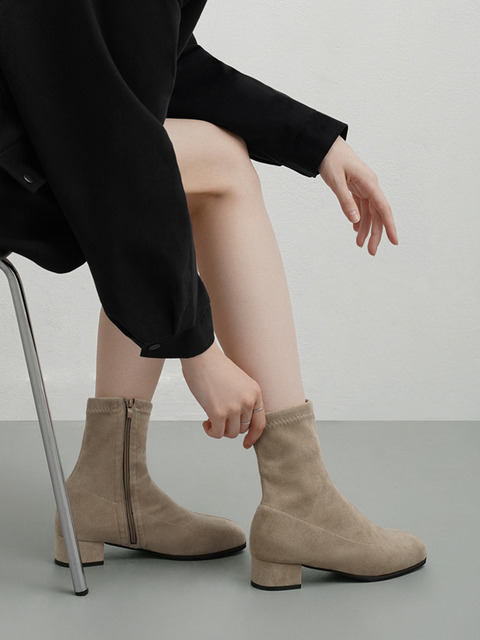 [애슬릿] 스웨이드 스퀘어 토 삭스 스판 앵클 부츠 6cm