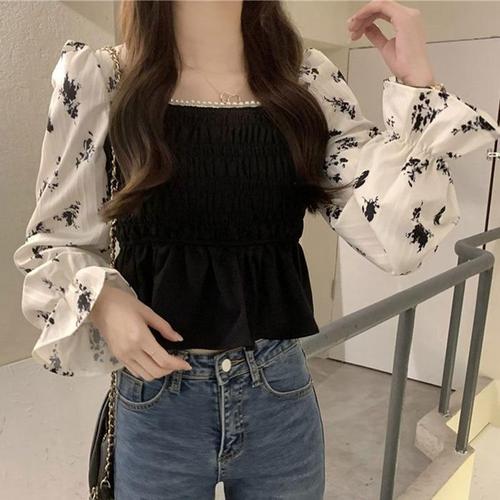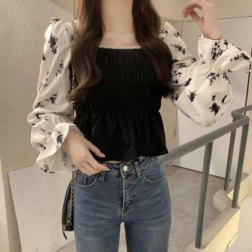 [끌레아]스퀘어넥 스모크밴딩 배색 소매 플라워 블라우스 크롭