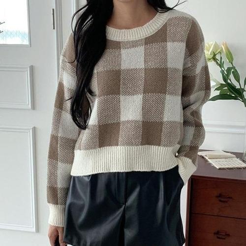 [엄지척]여자 체크 스타일 세미 크롭 니트티 고품질 가을 겨울_19803504_667501