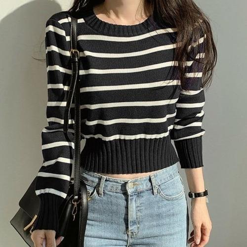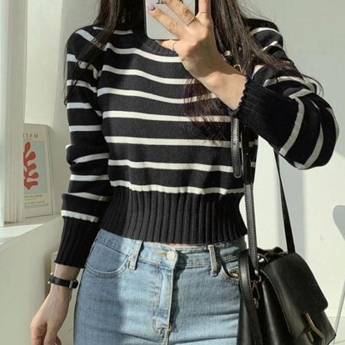 [엄지척]여자 크롭니트티 스트라이프 드롭숄더 라운드넥니트_19680149_667501