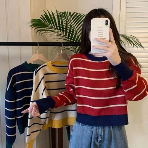 [엄지척]여성 크롭탑 배색 니트 스웨터 니트티 스트라이프_19681743_667501