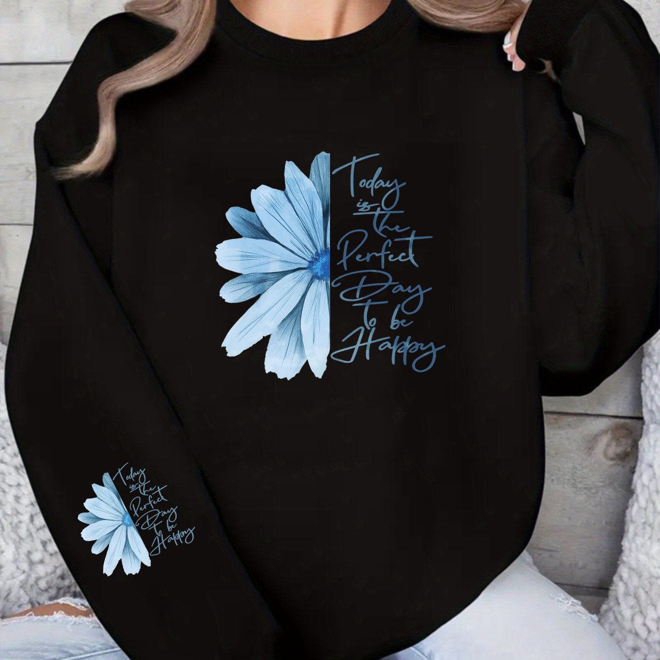 TEMU 여성용 포근한 플리스 안감 긴팔 스웨트셔츠, 플로럴 프린트 & "오늘은 아름다운 날" 디자인 - 부드럽고 세탁기 사용 가능, 라운드넥, 올 시즌 캐주얼 풀오버, 캐주얼 웨어 | 플로럴 프린트 탑 | 스웨트셔츠