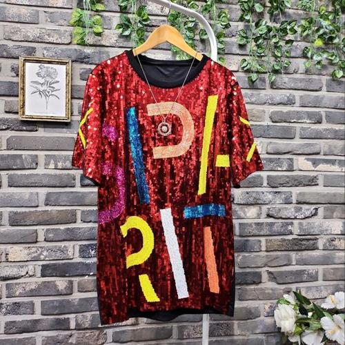 SH172 MISS 봉쥬르 숏 컬러풀 스팽글 반짝이 빅사이즈 박스 루즈핏 오버핏 반팔 짧은 티셔츠