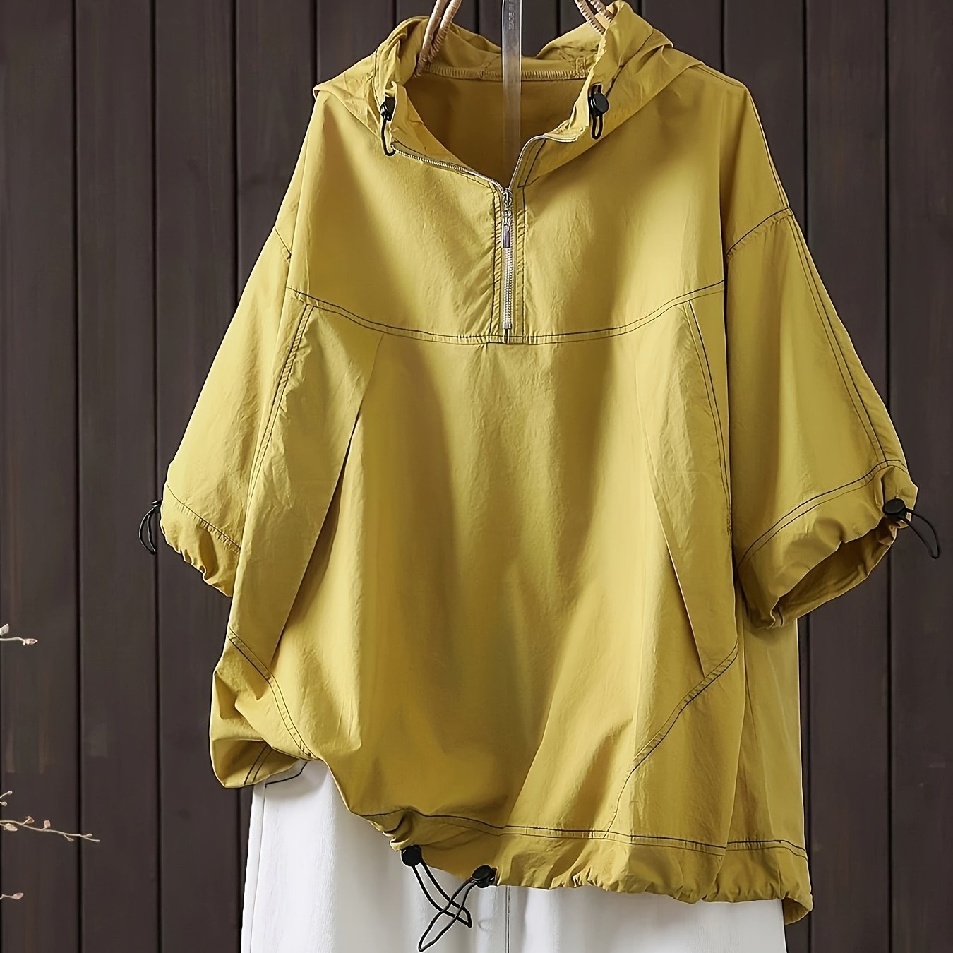 TEMU 여성용 캐주얼 하프 지퍼 후드 재킷, 7부 소매, 루즈핏 작업복 스타일 (드로스트링 헴 포함), 대비되는 스티칭 디자인. 출퇴근, 직장, 스타일리시하고 편안한 신상 봄/여름 컬렉션으로 적합