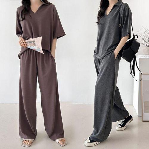 [보리맘]반팔 카라넥 티셔츠 롱 와이드 슬랙스 세트 루즈핏 홈웨어 외출복 찰랑찰랑 상하복 R242