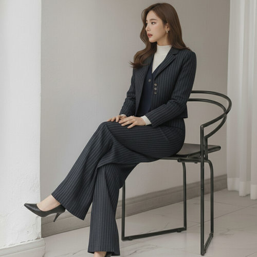 스타일라떼 / 여성 스트라이프 바지정장세트 크롭자켓 슬랙스 조끼 쓰리피스 셋업수트