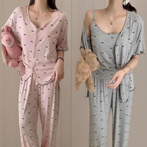 [신상오픈런]여성용 리본무늬 캡슬리브 반팔 티셔츠 팬츠 잠옷 세트