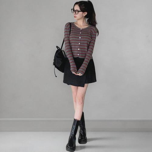 [옷자락]여성 키치무드 컬러배색 스트라이프 슬림핏 니트 카디건