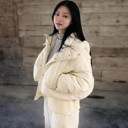 [신상오픈런]여성 하이넥 후드 버튼 니트 시보리 다운 점퍼