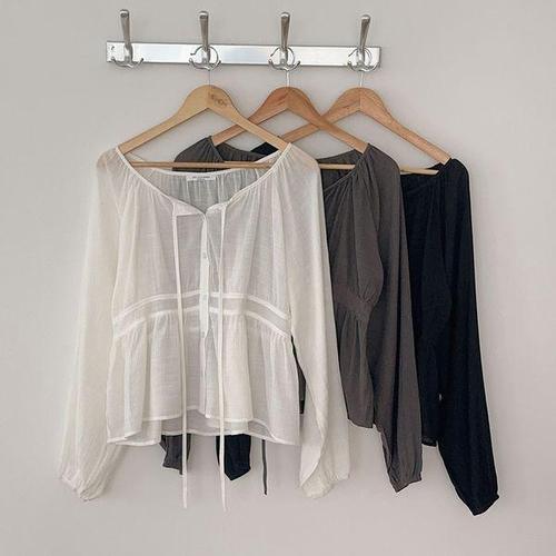 [옷자락]여자 드레이프 롱타이 시스루 하객룩 루즈 블라우스
