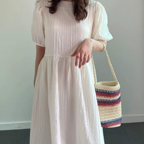 보니제이 / 라운드넥 퍼프소매 링클 롱 플레어 원피스 시어서커