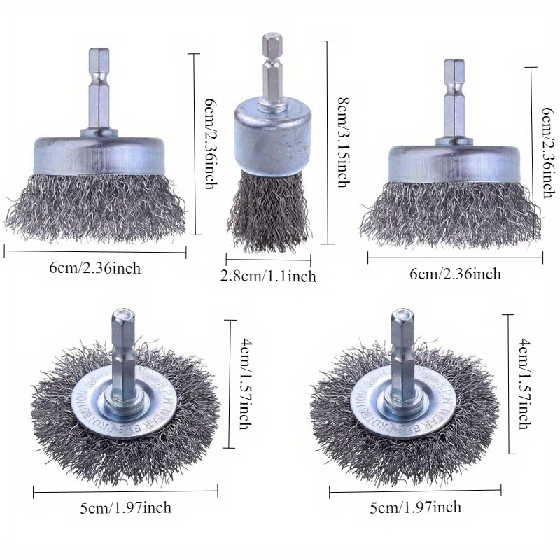 TEMU 드릴 스틸 와이어 브러쉬 세트 5개, 1/4인치 (약 0.6cm) 육각 생크 연마 와이어 휠, 드릴용 와이어 컵 브러쉬, 페인트 및 녹 제거용 굵은 압착된 탄소강 와이어 브러쉬 세트