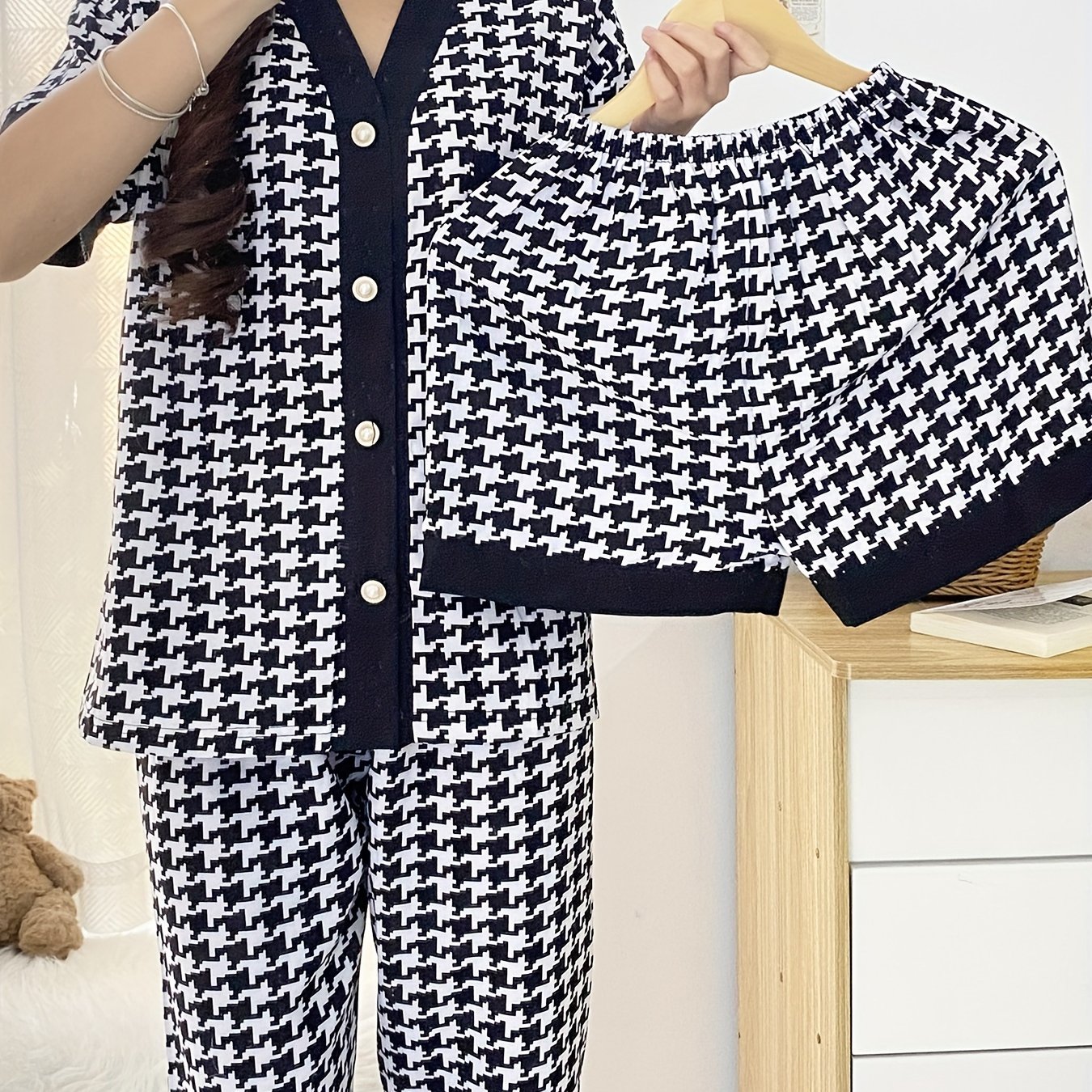TEMU 성숙한 하운드투스 무늬 라운지 세트, 반팔 버튼 업 V넥 상의 & 신축성있는 쇼츠 & 바지, 여성용 라운지웨어