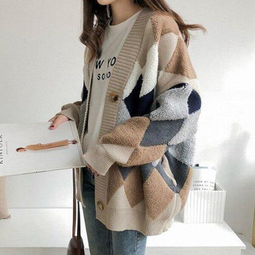 모던한 아가일 패턴 브이넥 캐주얼 여자 가디건 자켓