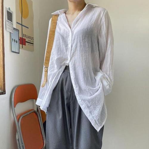 라이아 여성 시스루 셔츠 남방 아사 루즈핏 긴팔 롱 블라우스 여름