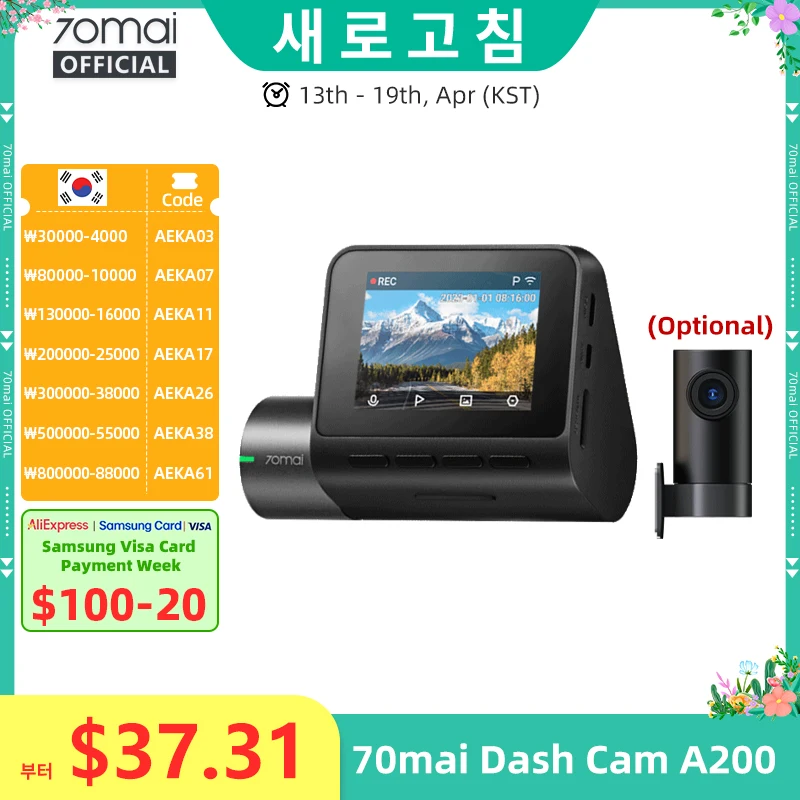 글로벌 70mai 대시캠 A200 듀얼채널 녹화 1080P HDR 2인치 IPS 스크린 24시간 주차 모니터링 차량용 DVR 70mai A200 WIFI 앱 130 ° FOV