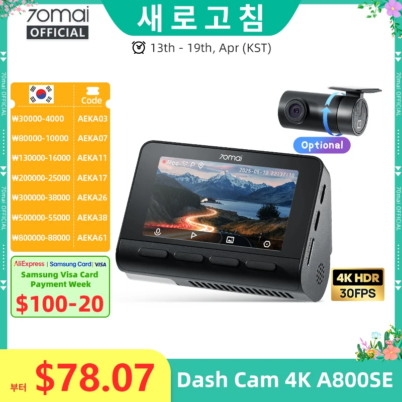 70mai 4K 블랙박스 A800SE 70mai A800S 음성 제어 슈퍼캡타이어 GPS ADAS 차량용 DVR 70mai A800SE UHD Wifi 6 업그레이드 버전