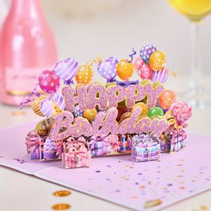 TEMU 반짝이는 보라색 3D 팝업 생일 카드, 반짝이는 황금 '생일 축하' 문구, 하트 디자인 및 풍선 - 그녀, 엄마, 어머니의 날, 결혼식, 교사 감사, 기념일 및 추수감사절에 완벽함 - 축제 파티 장식 및 선물 아이디어, 생일 장식