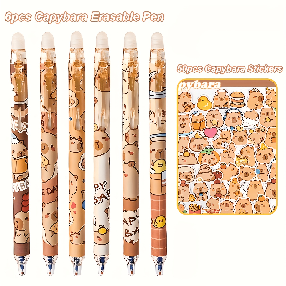 TEMU 56팩 카피바라 테마 지우개 젤펜, 6개 리트랙터블 카피바라 펜 & 50개 스티커, 0.5mm, 블루잉크, 부드러운 필기감, 사무실, 학교, 파티 선물, 장식용 문구, 학용품