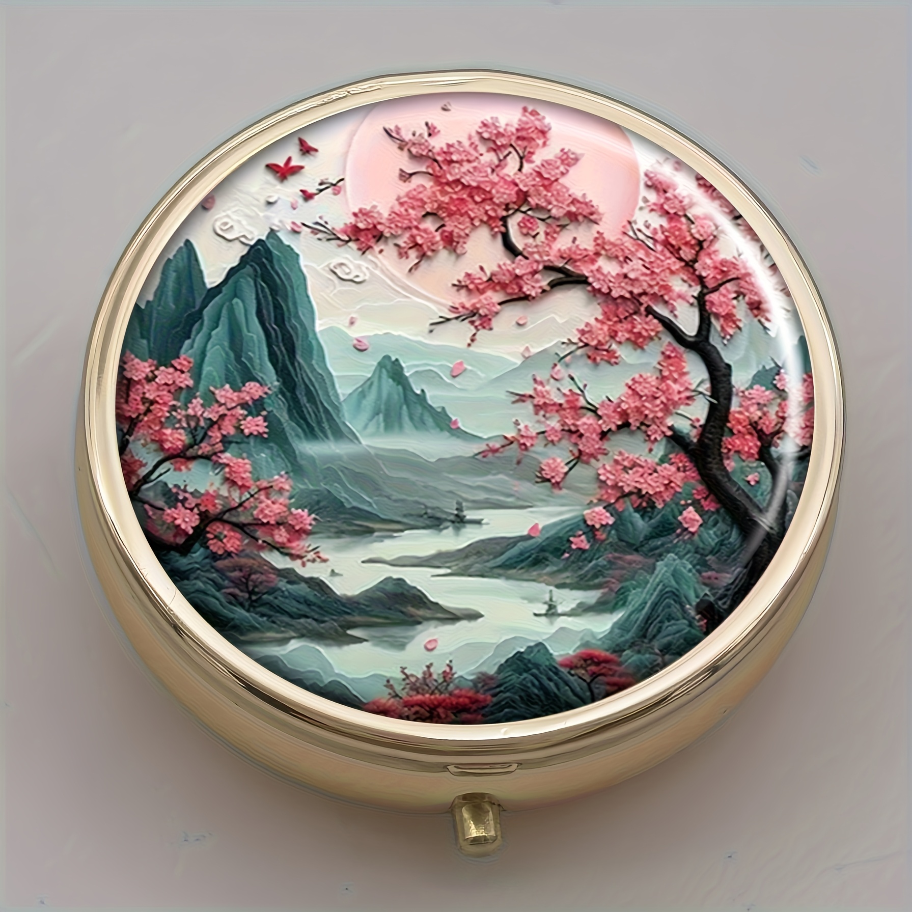 TEMU 일본식 자작나무 3개 구멍 금색 원형 휴대용 디자인, 전통적인 풍경 예술을 담은 미니 약품 정리함, 여행에 편리하고 의료 사용을 위한 고민된 선물, 지갑용 약통, 장식용 보관함, 세밀한 디자인