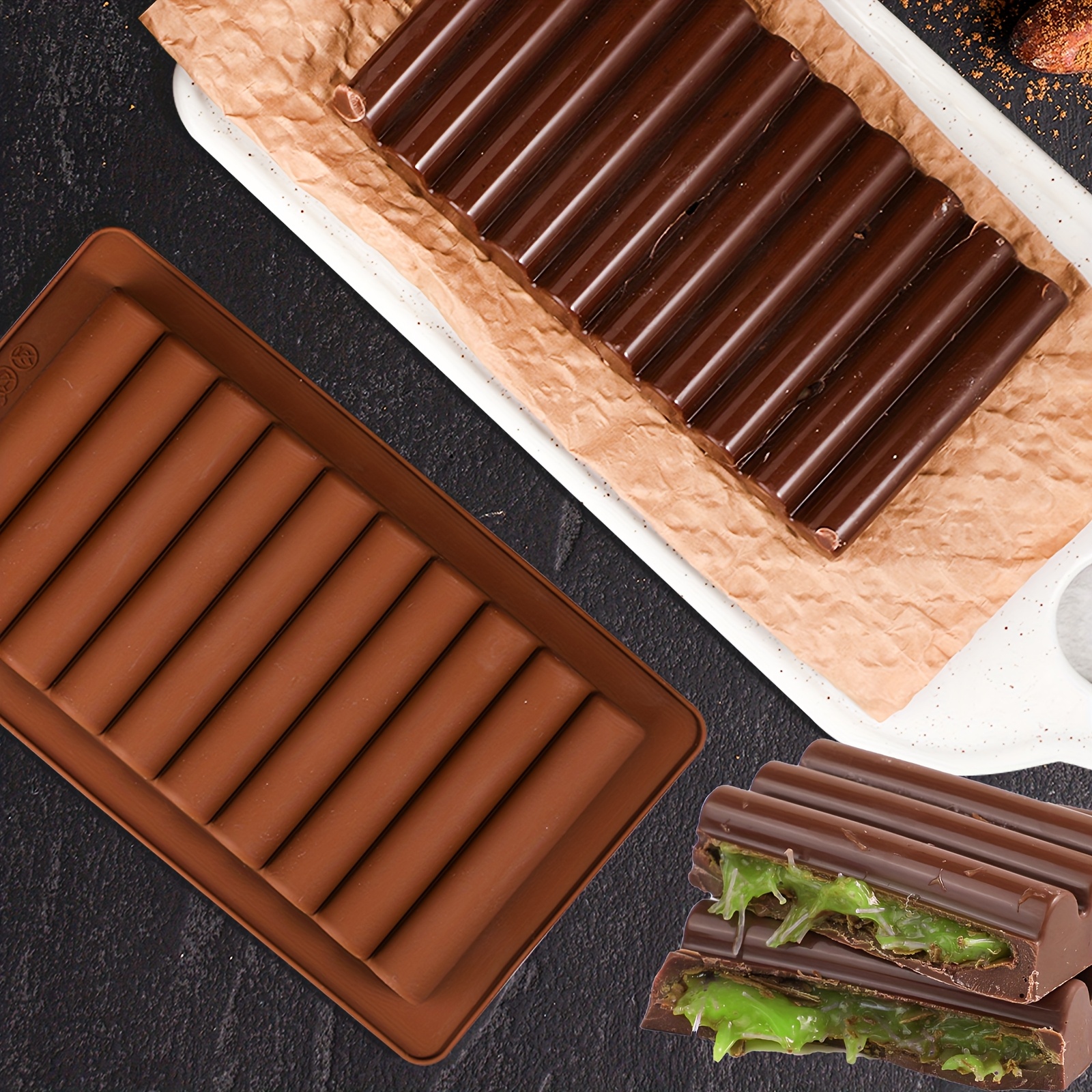 TEMU 키가 크고 깊은 실리콘 두바이 초콜릿 바 몰드, 초콜릿 바와 사탕 만들기용으로 다양한 초콜릿 모양을 위한 2개의 충전구멍과 줄무늬 물결 패턴 포함. 필수 주방 도구, 두바이 초콜릿 몰드