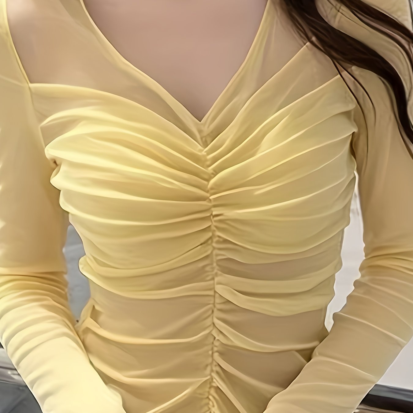 TEMU 여성용 옐로우 V넥 멀티 레이어 플리츠 네트 새틴 숏 탑 - 슬림핏 롱슬리브 블라우스, 사계절용, 반투명, 특별한 날, 선물용, 세탁기 사용 가능, 솔리드 컬러 아님|여성블라우스