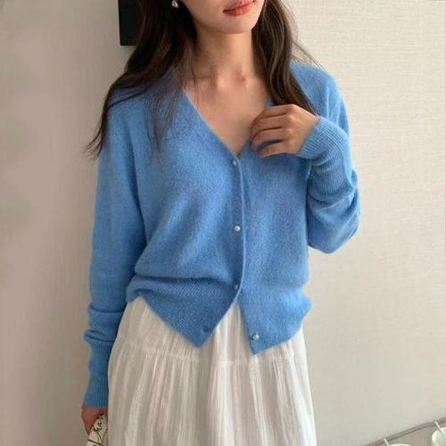 [다잇템]여성 스웨터 V넥 앙고라 진주단추 가디건