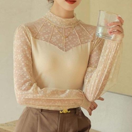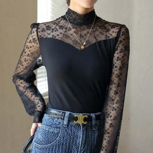 여성용 봄 가을 슬림핏 반폴라 긴팔 시스루 망사 티셔츠 도트 글리터 반짝이 상의 데일리 스판 얇은 하프넥 슬림 이너