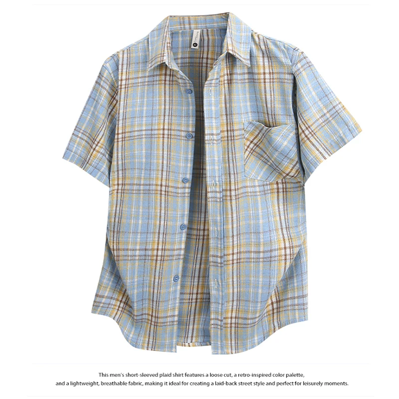 빈티지 아메리칸 스타일 새로운 반팔 체크 무늬 셔츠 캐주얼 게으른 스타일 남성 셔츠 코트 심플한 디자인 루즈하고 올 매치