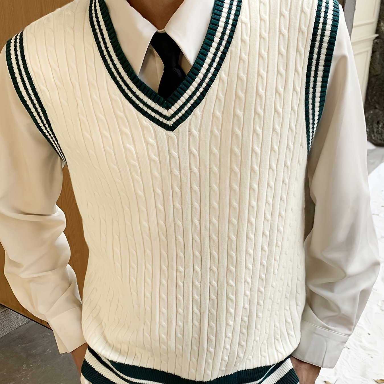 TEMU 남성용 민소매 브리티시 대학 스타일 케이블 니트 디자인, 화이트 & 그린 트림, 캐주얼 및 포멀한 의상에 어울리는 따뜻한 겨울 니트 조끼