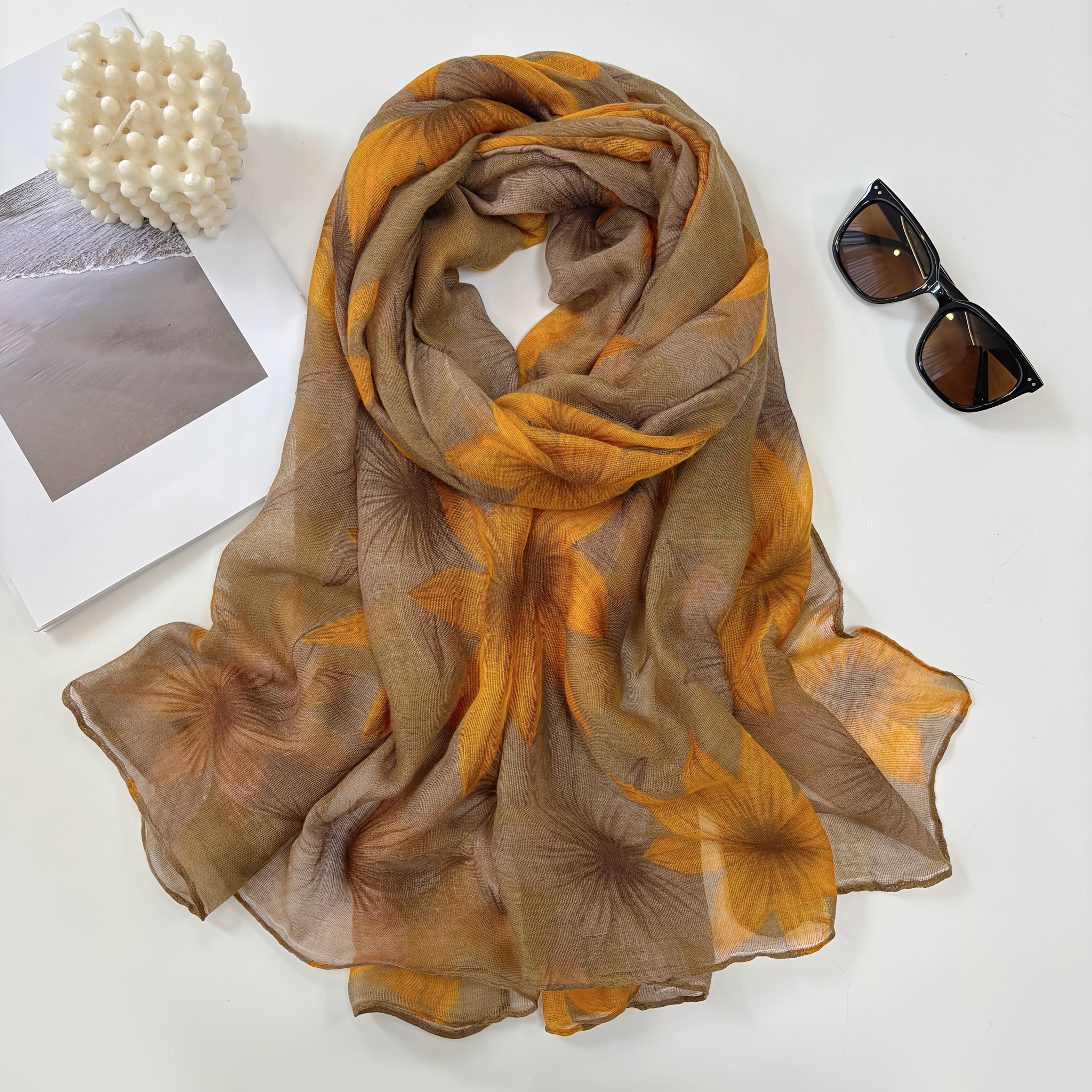 TEMU 여성용 빈티지 플로럴 프린트 스카프 숄 - 대형 랩 - 가벼운 우아한 브라운 & 옐로우 꽃무늬 패턴 - 매일 및 공식 복장에 적합, 사무실, 파티, 결혼식 액세서리 - 시원한 날씨 레이어링을 위한 통기성 , 레트로 스타일, 비탄력 소재