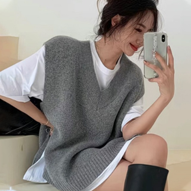 여성 네일 비즈 슬리브리스 니트 탱크탑 프렌치 엘레강스 라운드넥 슬림 화이트 베스트