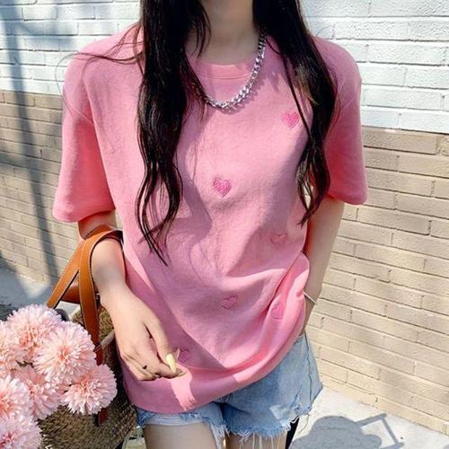 [엄지척]여성 캐주얼 오버핏 하트 레터링 엠보 맨투맨 티셔츠_19645573_667501