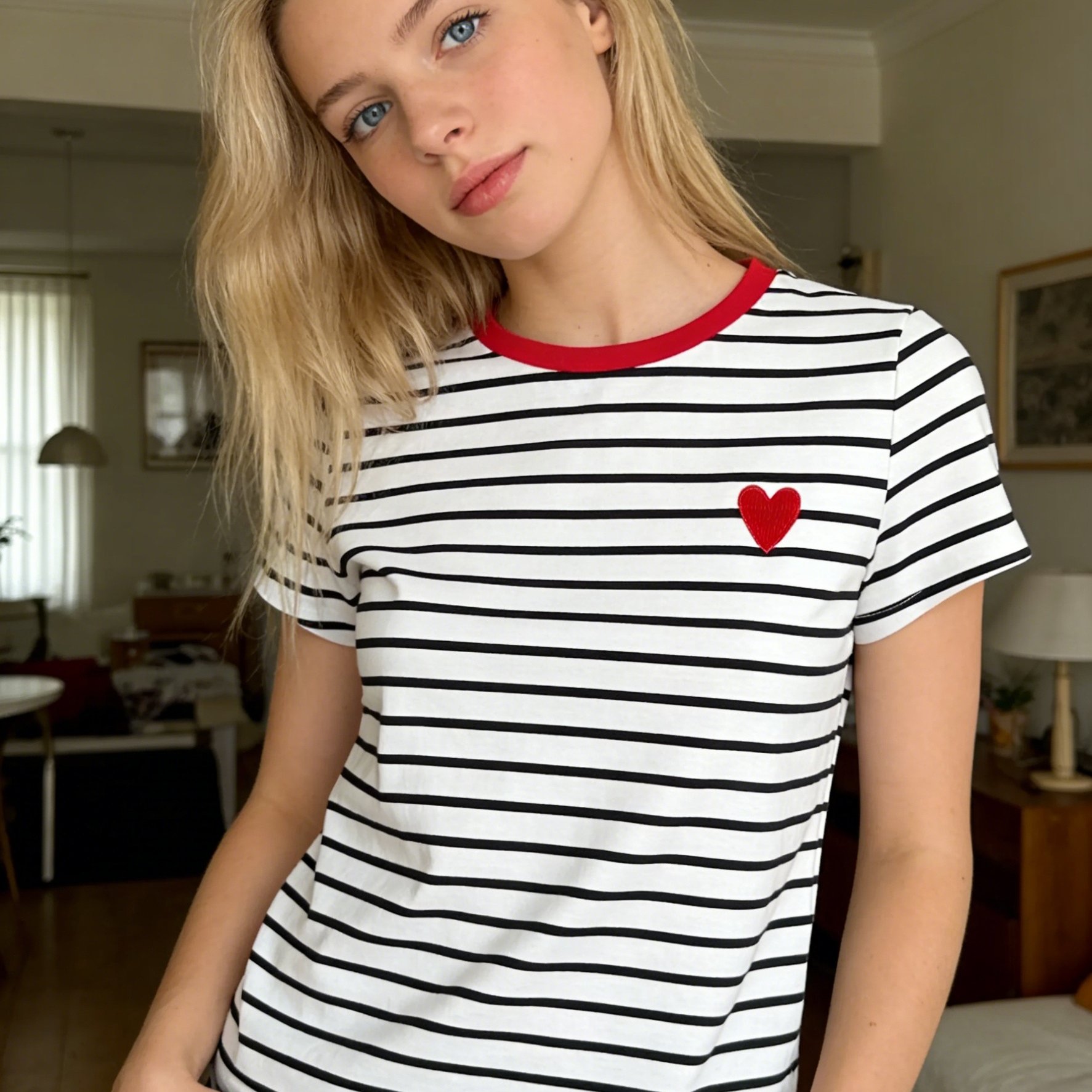 TEMU 여성 캐주얼 반팔 티셔츠, 흰색 및 검은색 및 빨간색 라운드넥 반팔 상의, 모든 계절에 적합, 여성 티셔츠, 여름 의류, 클래식 라운드넥, 세탁기 사용 가능 및 드라이클리닝 가능