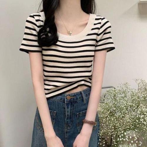 Asure 1+1 간절기 여성 니트 스트라이프 반팔 티셔츠