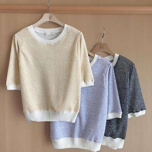 [신상오픈런]여성 여름 파스텔 색상 배색 라운드넥 반팔 니트
