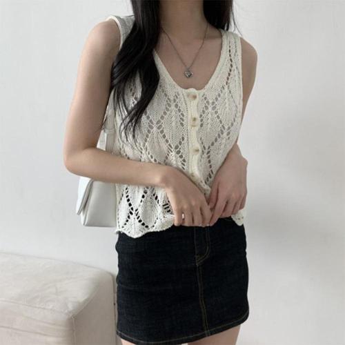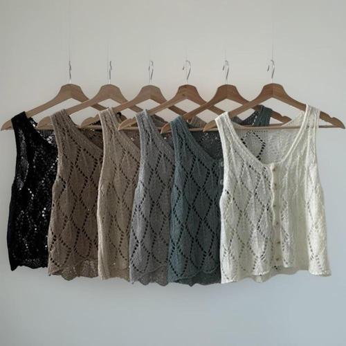 |KMJ65AE|여성 여름 니트 조끼 시스루 펀칭 버튼 스카시 리프