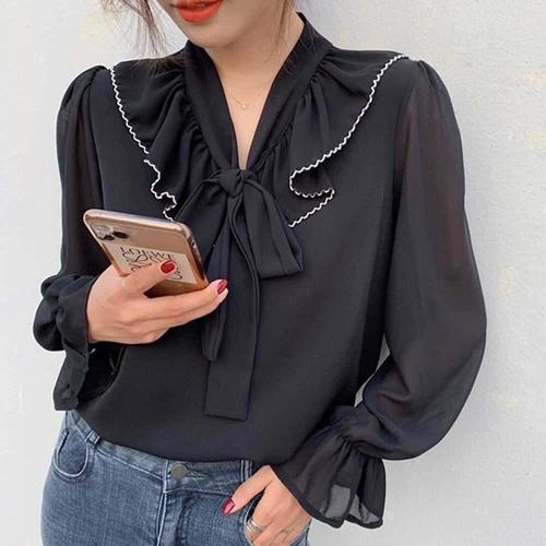 [모노무드]모노무드 프릴 리본 쉬폰 블라우스 긴팔 봄여름 배색라인
