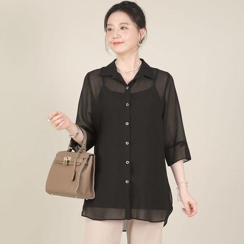 [애비뉴투지]엄마옷 고실한 쉬폰 시스루 셔츠 카라 단추 여성 여름 칠부 하프 남방 블라우스 B08525