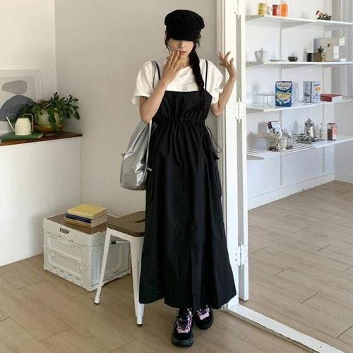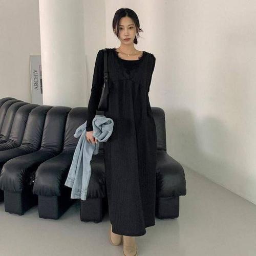 [에이치플러스몰]롱니트 뷔스티에 쉬폰 바스락 여름 데님 원피스