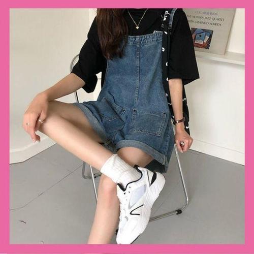 [에이치플러스몰]오버롤 밑단접힌 청 데님 멜빵 여름 청바지 멜빵반바지 데님청 귀여운 큐트 멜빵코디