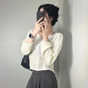 [갓샵] 여름 니트 보트넥 입술넥 그물 시스루 티 2color 여성 얇은 여리핏 루즈핏 세미 크롭 오프숄더 긴팔