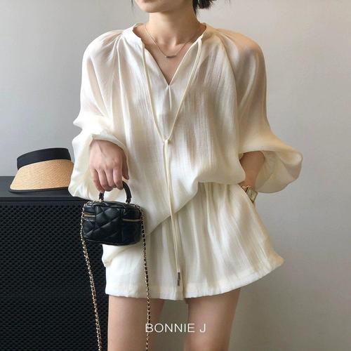 [유아몽드]여름 투피스 끈 노카라 브이넥 긴소매 블라우스 숏팬