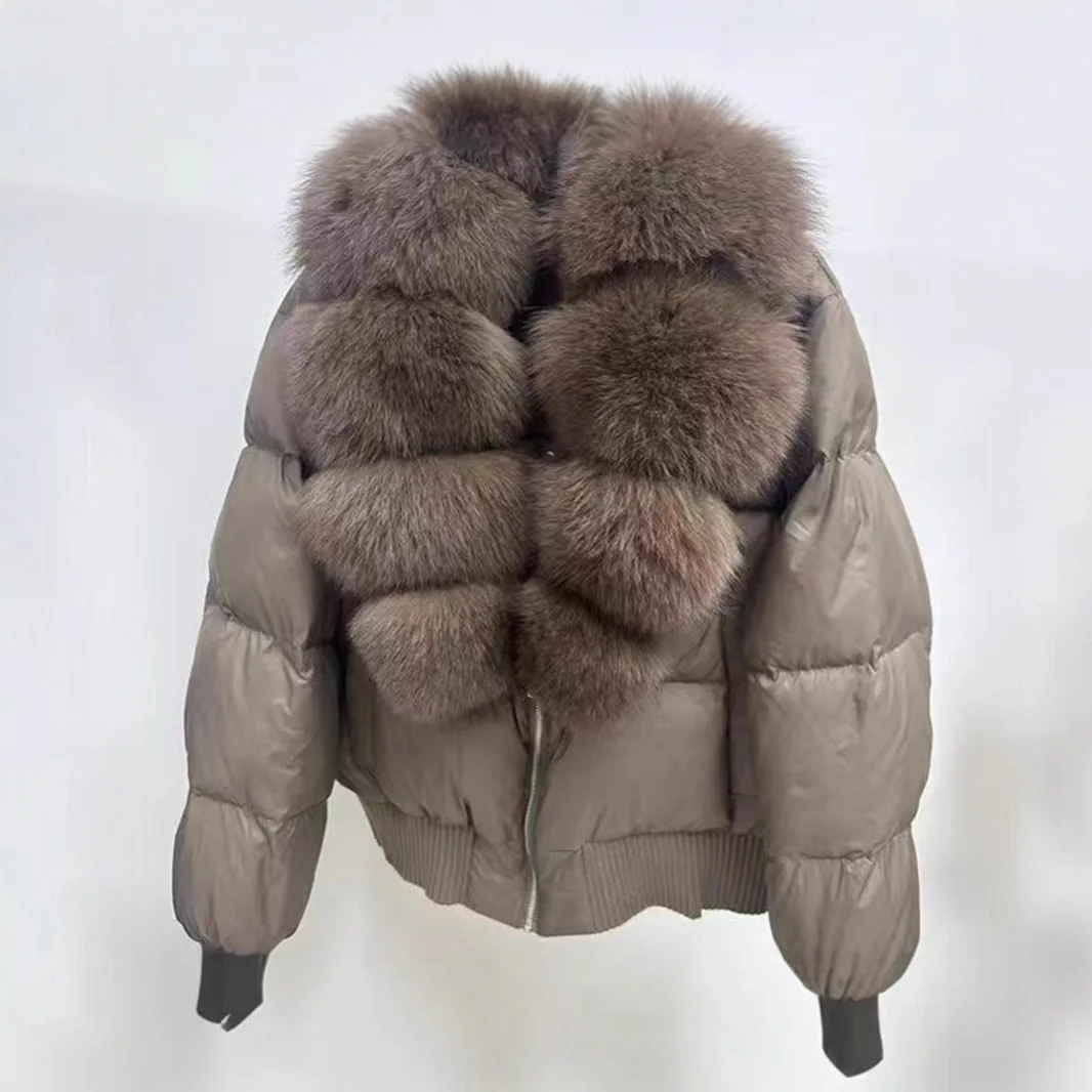 친환경 겨울 숏 화이트 덕다운 재킷 따뜻한 여성용 인조 모피 칼라 푸퍼 재킷 패션 페이크 퍼