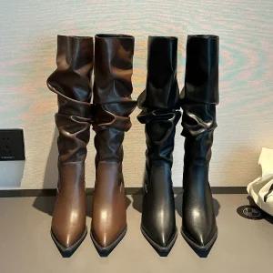 아이위크 주름 스틸레토힐 여자 가죽 롱부츠 여성 장화 굽7.5cm 225-250mm