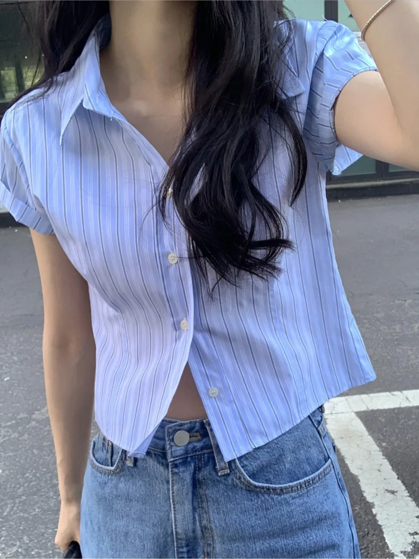 시크한 여름 안티에이징 레트로 반팔 셔츠 여성용 하이웨이스트 슬림핏 스트라이프 셔츠 출퇴근 스타일 기타 소재