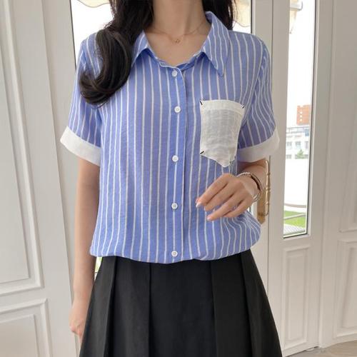 [셀러허브_여성트랜드패션]Rly 스트라이프 반팔 셔츠 블라우스 캡소매 카라넥 여