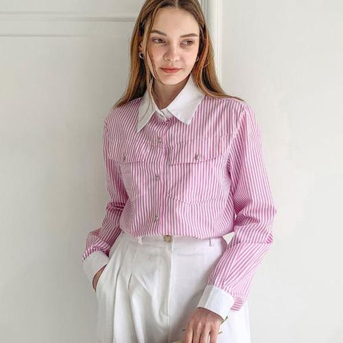 [에이치플러스몰]카라 셔츠 스트라이프 긴팔 블라우스 남친룩